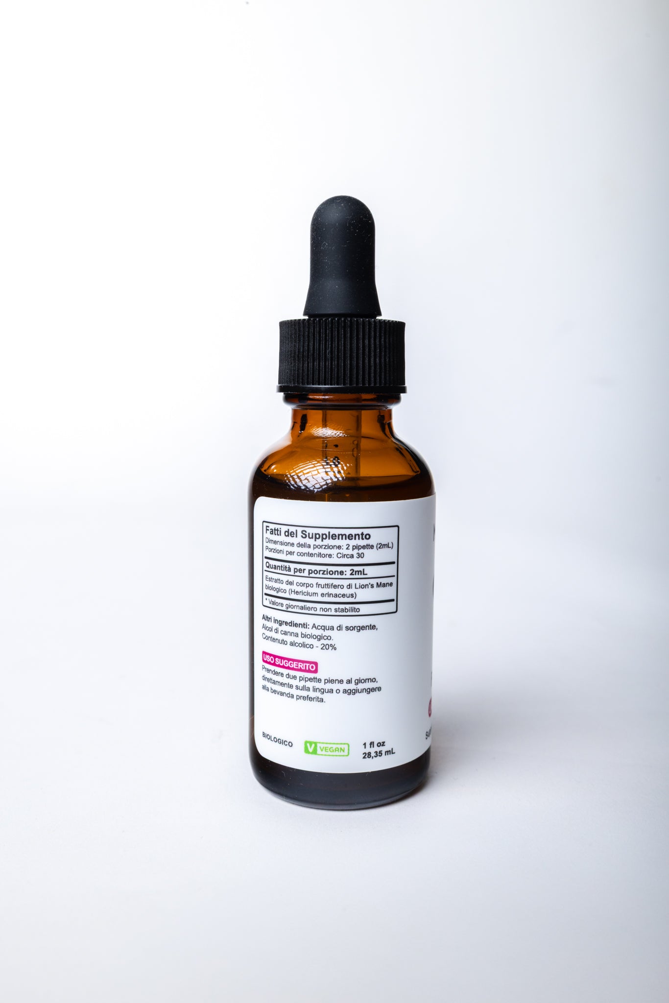 Estratto di Criniera di Leone (Hericium erinaceus) coltivato su legno, acqua distillata, alcol biologico.